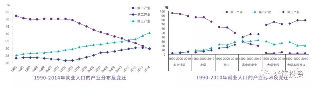 目前,中国的劳动力分布已经形成第三产业>第二产业>第一产业的格局,第三产业占比已超过40%。从学历上看,大专学历就业者70%在第三产业,本科以上学历更是高达80%。而从事农业劳动力越来越少,大专以上学历占比只有1%左右。