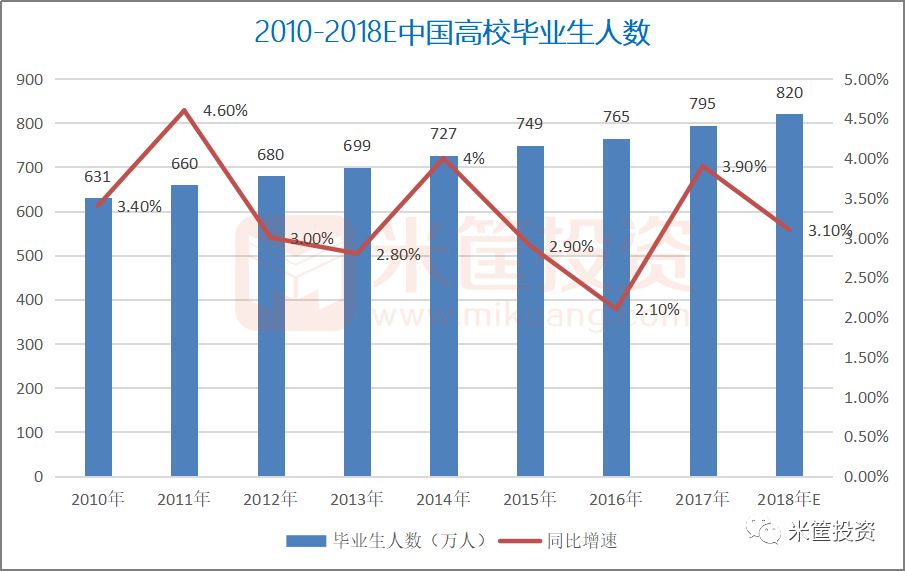 与之对应,每年高校毕业生人数也屡创新高,2018年,预计将有820万毕业生涌入就业市场。大学生的需求最大,供给增长幅度也是最大的,“遍地都是大学生”已是常见现象。