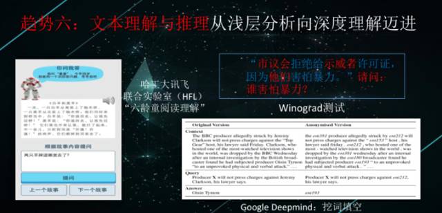 Google等都已经推出了这样的测试机——以阅读理解作为一个深入探索自然语言理解的平台。就是说,给计算机一篇文章,让它去理解,然后人问计算机各种问题,看计算机是否能回答,这样做是很有难度的,因为答案就在这文章里面,人会很刁钻地问计算机。所以说阅读理解是现在竞争的一个很重要的点。