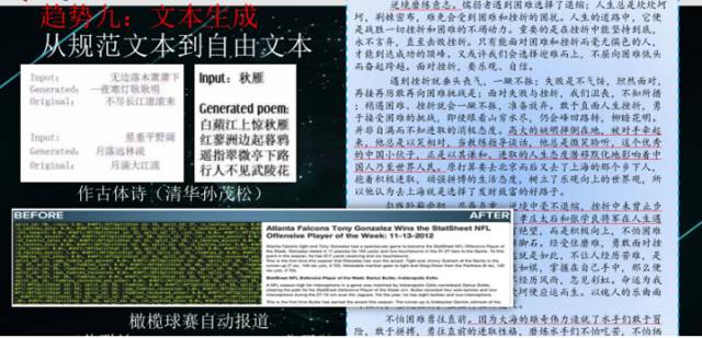 文本生成这两年很火,从生成古诗词到生成新闻报道到再到写作文。这方面的研究价值是很大的,它的趋势是从生成规范性的文本到生成自由文本。比如,我们可以从数据库里面生成一个可以模板化的体育报道,这个模板是很规范的。然后我们可以再向自由文本过渡,比如写作文。