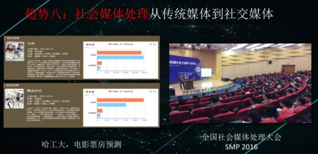 相应的,在社会媒体处理上,从传统媒体到社交媒体的过渡,情感的影响是一方面,大家还会用社交媒体做电影票房的预测,做股票的预测等等。