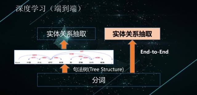 实际工作中,我们面临着一个课题——信息抽取。我之前和一个单位合作,初衷是我做句法分析,然后他们在我的基础上做信息抽取,相互配合,后来他们发表了一篇论文,与初衷是相悖的,它证明了没有句法分析,也可以直接做端到端的直接的实体关系抽取,这很震撼,不是说现在句法分析没用了,而是我们认为句法分析是人为定义的层次,在端到端的数据量非常充分,可以直接进行信息抽取的时候,那么不用句法分析,也能达到类似的效果。当端到端的数据不充分时,才需要人为划分层次。