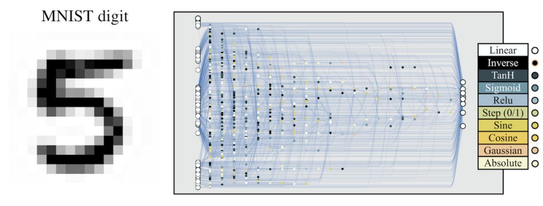 即使是在高维分类任务中,WANN 方法依然表现非常好(如图 5 左所示)。虽然局限于单个权重值,WANN 方法能够分类 MNIST 数字,且性能堪比具备数千个权重的单层神经网络(权重通过梯度下降进行训练)。创建的架构依然保持权重训练所需的灵活性,从而进一步提升准确率。