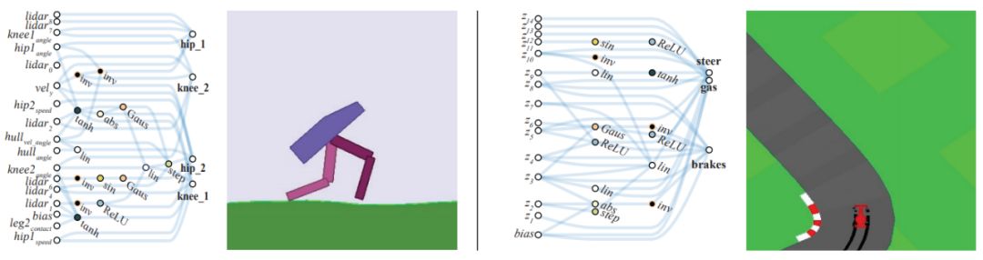 如下是两个不用学习权重的神经网络示例,分别是二足行走智能体(上)和赛车(下):
