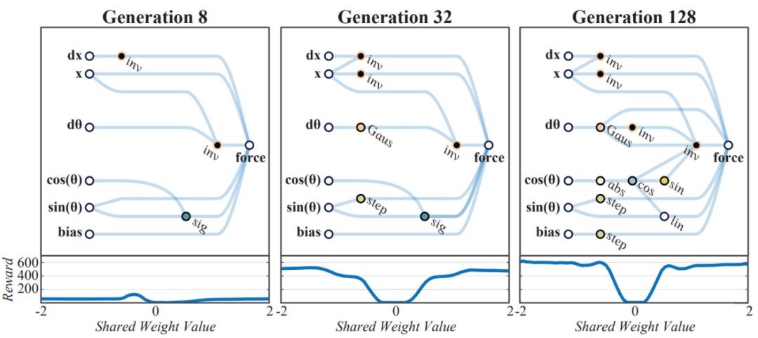 图 4:权重无关拓扑随着时间的变化。Generation 128:添加复杂度,以改进小车的平衡动作。