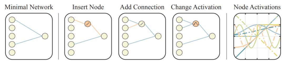 鉴于网络的前馈本质,在之前不连接的节点之间添加新连接。当隐藏节点的激活函数被改变后,激活函数进入随机分配模式。激活函数包括常见函数(如线性激活函数、sigmoid、ReLU)和不那么常见的(如 Gaussian、sinusoid、step),它们编码输入和输出之间的多种关系。