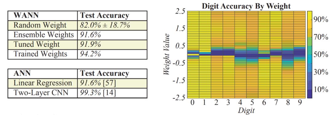 上图左:以多个权重值作为集成进行实例化的 WANN 比随机权重采样的网络性能好得多,且性能与具有数千个权重的线性分类器相同。上图右:在所有数字上具有更高准确率的单个权重值不存在。WANN 可被实例化为多个不同网络,它们具有创建集成的可能性。