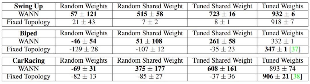 传统的固定拓扑网络仅在大量调参后才能生成有用的行为,而 WANN 使用随机共享权重都可以执行任务。
