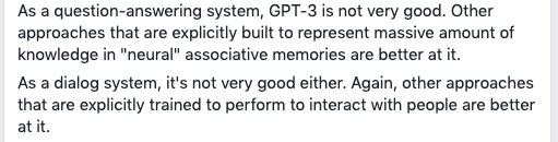 作为一个对话系统,GPT-3也不是很好。同样地,其他被明确训练来与人互动的模型在这方面做得更好。