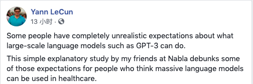 LeCun 引用了医疗AI公司 Nabla 的一项最近的实验,该实验发现GPT-3完全不足以在医疗环境中使用,因为GPT-3 编写出来连贯的句子与其推理或理解的意思不同。