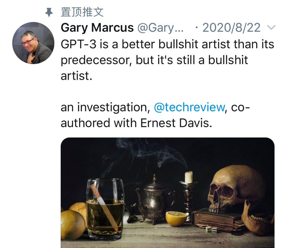 马库斯对GPT-3的「蔑视态度」,从他的置顶推文中就可以洞见。