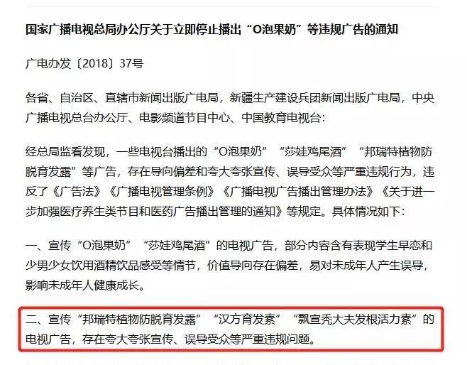 2018年6月,广电总局就直接禁止了宣传“邦瑞特植物防脱育发露”、“汉方育发素”和“飘宣秃大夫发根活力素”的电视广告,称其存在大夸张宣传、误导受众等问题。