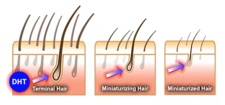 这样一来,DHT会加快毛囊缩小、缩短毛囊寿命,使生出的头发变细变短,还没长到足够长就会掉。