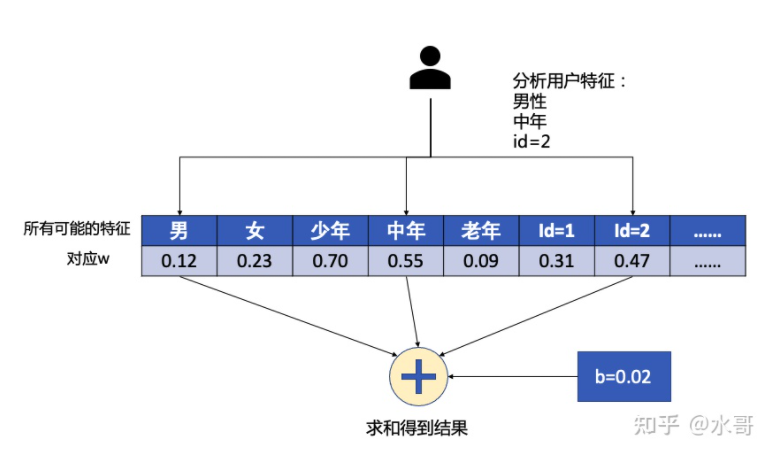 在这个例子中,有三种特征,性别,年龄段,和user ID。注意到这里 的表格需要存储所有可能的特征取值。对于当前的用户我们就分析,他的性别,年龄段,ID分别是什么。由于 是0/1的,直接取出对应的 ,并且和 相加。这里只画了用户侧的部分,item侧也是同样的道理。