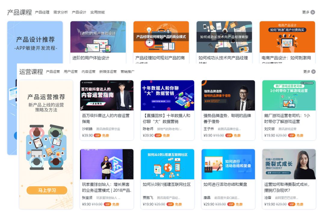 具体包含录播课涵盖产品、运营、营销推广、用户体验、数据分析等细分维度;直播课囊括最新的运营项目剖析、行业前沿领域探究、大咖运营经验分享等,以及每月一期的导师通过视频+语音形式在线答疑,解决你在工作中遇到的具体问题。
