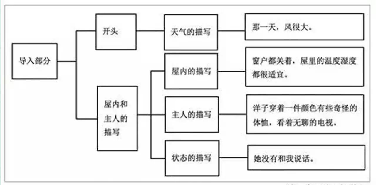 推特小说大赛并没有继续办下去,因此,到了第二期(2014~2015年),佐藤教授的目标也改成了400字以上。在这一阶段,他们开始考虑文章的构造。研究小组认为,小说的背后应该有一个构造,这个构造使用一些部件组成,每个部件会自动生成句子。他们以文章的开始几段为例,讲解了具体的生成过程。如图1所示,导入部分为开头及关于屋内和主人的描写两部分。其中,开头由天气的描写这一部件构成,而关于屋内和主人的描写则是由三个部件构成:屋内的描写,主人的描写和状态的描写。