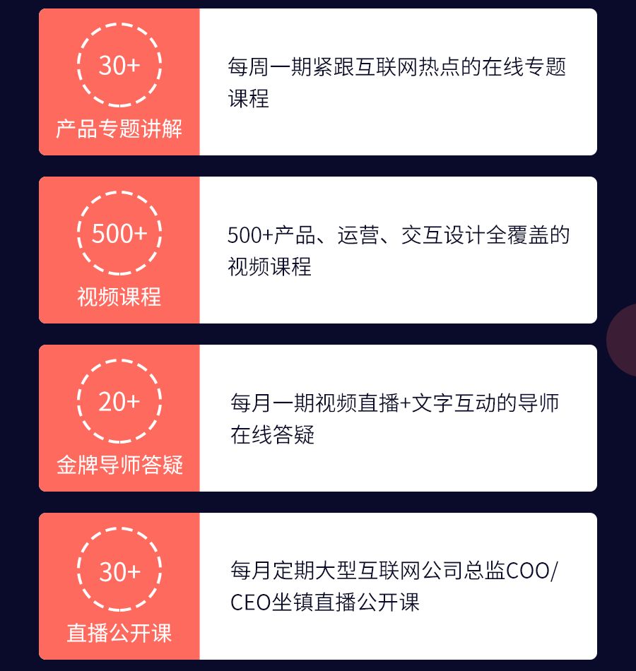 一线导师资源,系统课程内容,丰富的增值服务,系统搭建3年以上产品经理的职场晋升能力模型。