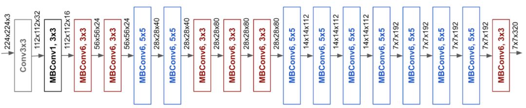 由此产生的架构使用移动倒置瓶颈卷积(MBConv),类似于MobileNetV2和MnasNet,但由于FLOP预算增加而略大。然后,通过扩展基线网络以获得一系列模型,被称为EfficientNets。
