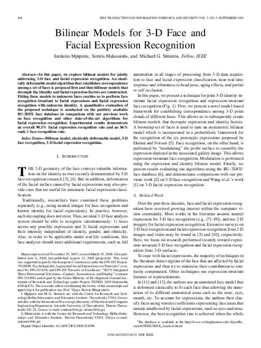 · Bilinear Model for 3D Face and Facial Expression Recognition,Iordanis Mpiperis,Fellow,IEEE,2008.