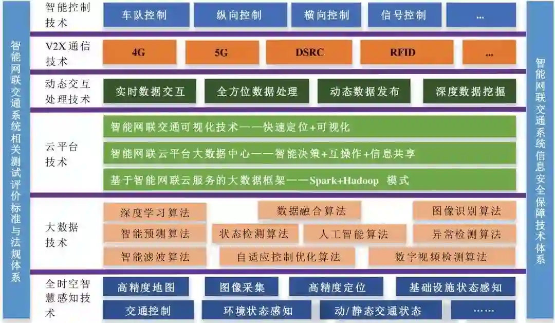 智能网联交通系统融合智能汽车与智能道路的技术优势,涉及汽车、道路交通、计算机、通讯等诸多领域,其包括六大关键技术及两大保障体系。