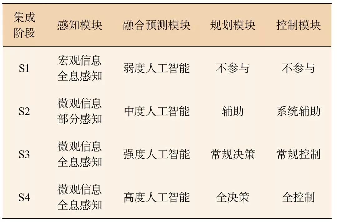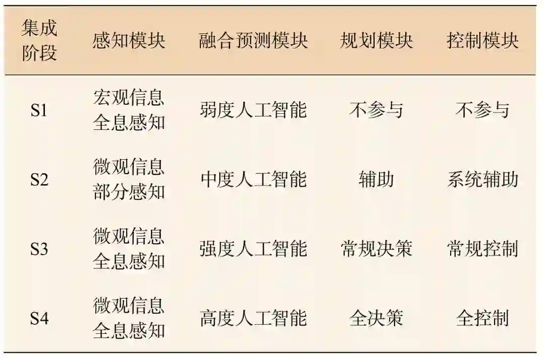 智能网联交通系统包括感知模块、融合预测模块、规划模块和控制模块等 4 个关键部分。在系统集成化不同阶段,关键模块参与程度不同,如表 1 所示: