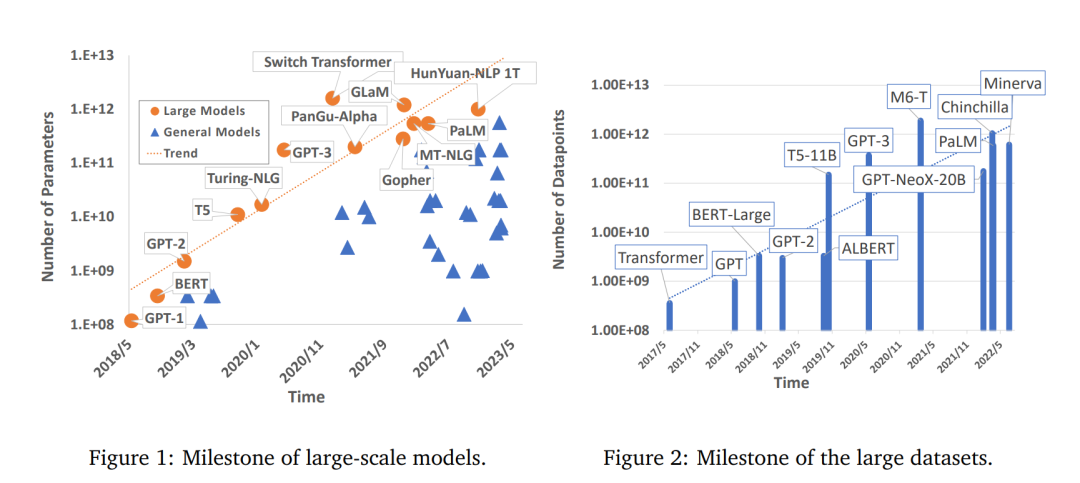 随着人工智能技术的快速发展,深度模型的参数以百万级甚至数十亿级的速度迅猛增长。Kaplan等人[110]将模型大小、数据集大小和用于训练的计算量之间的关系研究为幂律,并表明更大的模型本质上需要大量的数据,在学习上的样本效率明显更高。大型模型的部署也成为最重要的研究领域之一。例如,Dehghani等人[44]提出了ViT-22B,该模型展示了计算机视觉(CV)社区中“类LLM(大型语言模型)”扩展的潜力。GPT-1[196]提出了有监督微调以0.1B参数驱动语言模型。而两年后,GPT-3[18]在45TB数据样本上训练了175B参数,并在各种自然语言处理任务上成功取得了最先进的结果。图灵- nlg采用了大约172亿个参数的生成语言模型,只需一年时间就可以快速迭代到具有530B参数的规模较大的模型MT-NLG[229],这在几个任务中远远领先于GPT-3。我们总结了图1中提出的模型尺寸发展的里程碑。尽管从这种快速增长中获得的收益令人震惊,但为了保持实际效率,人们迫切期待在探索新技术和训练方面取得实质性进展。就目前而言,训练如此庞大的模型的巨大而昂贵的成本通常是不可接受的。具体来说,训练GPT-3消耗大约355 GPU年,成本为460万美元。在如此庞大的参数和数据样本下,传统的从零开始训练显然无法承受巨大的费用,特别是在扩展到下游任务[30,138,187,188,211,243]时,这将引入额外的架构和过多的参数。因此,预训练-微调模式在深度学习领域日益受到关注。