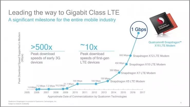 2016年初,美国高通公司发布了全球第一款支持千兆级LTE网络的产品,骁龙X16 LTE调制解调器。骁龙X16 LTE调制解调器率先引入了对免许可频谱资源的支持,可以在授权LTE频段和免许可频段之间无缝切换,在不同场景中自动选择最合适的频段接入运营商的千兆级LTE网络。