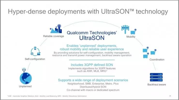 1. UltraSonTM是高通研发的一套自组织和自管理模式。在UltraSonTM的帮助下,运营商可以在住宅区、企业办公场所、体育馆等各种类型的场所中针对性地部署各种类型的小型基站,而这些小型基站能做到即插即用、自主设置并对网络进行自主优化,大大减轻了运营商在大规模部署时的工作压力,提升了小型基站网络的协同性能和稳定性。