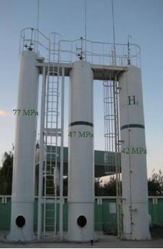 目前国内氢气储存方式主要有高压气态储氢、液态储氢和固态氢化物储氢等。在氢燃料电池汽车领域目前技术发展较成熟且应用最为广泛的是高压气态储氢。高压气态氢储存装置有固定储氢罐、长管气瓶及长管管束、钢瓶和钢瓶组、车载储氢气瓶等。国内在固定储氢罐研发上已取得显著成果,在攻克多项关键技术的基础上,利用自有专利技术已成功研制出了一种具有抑爆抗爆、缺陷分散、运行状态可在线监测的多功能全多层高压储氢罐,目前压力等级可达到45、77和98 MPa,相关技术指标达到国际领先水平。其中压力等级为45和77 MPa的容器见图1。长管气瓶组及长管拖车已在国内制造,并在一些制氢工厂、用氢的企业和加氢站安装、运行,图2为45 MPa的长管气瓶组。中小规模固体氢化物储存装置已在PEM备用电源和一些用氢单位应用。
