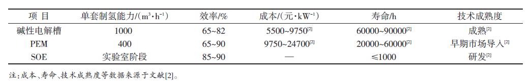 水电解制氢装置包括碱性电解水制氢、纯水质子交换膜(PEM)电解水制氢和固态氧化物电解质(SOE)电解水制氢等装置。前两类装置在国内均有运行,SOE正在研发当中,3种装置的比较如表1所示。