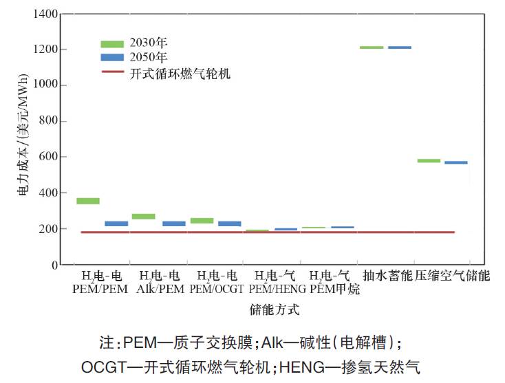 近年来,中国风电、光电、水电等可再生能源的占比逐年增加,由于这类电力的波动性和一些地区、城市电网的峰谷负荷差异较大,造成了电网储能系统的设置需求明显,各种储能方式(系统)的开发研究逐渐兴起,压缩空气储能、飞轮储能、蓄电池储能等均在研究和实验。图4为各种储能方式的投资比较。其中,在国内已建设多座抽水蓄能电站,尽管其有较好的削峰填谷效益,但同时受地理条件限制和投资的影响较大,此类项目的建设应十分慎重。伴随着氢能技术和产业的发展,氢储能系统应用将成为较为现实、可行的选择。2015 年国际能源署(IEA)发布的《Technology roadmap hydrogen andfuel cells》(《氢能和燃料电池技术路线图》)中提出氢储能系统应用的内容。