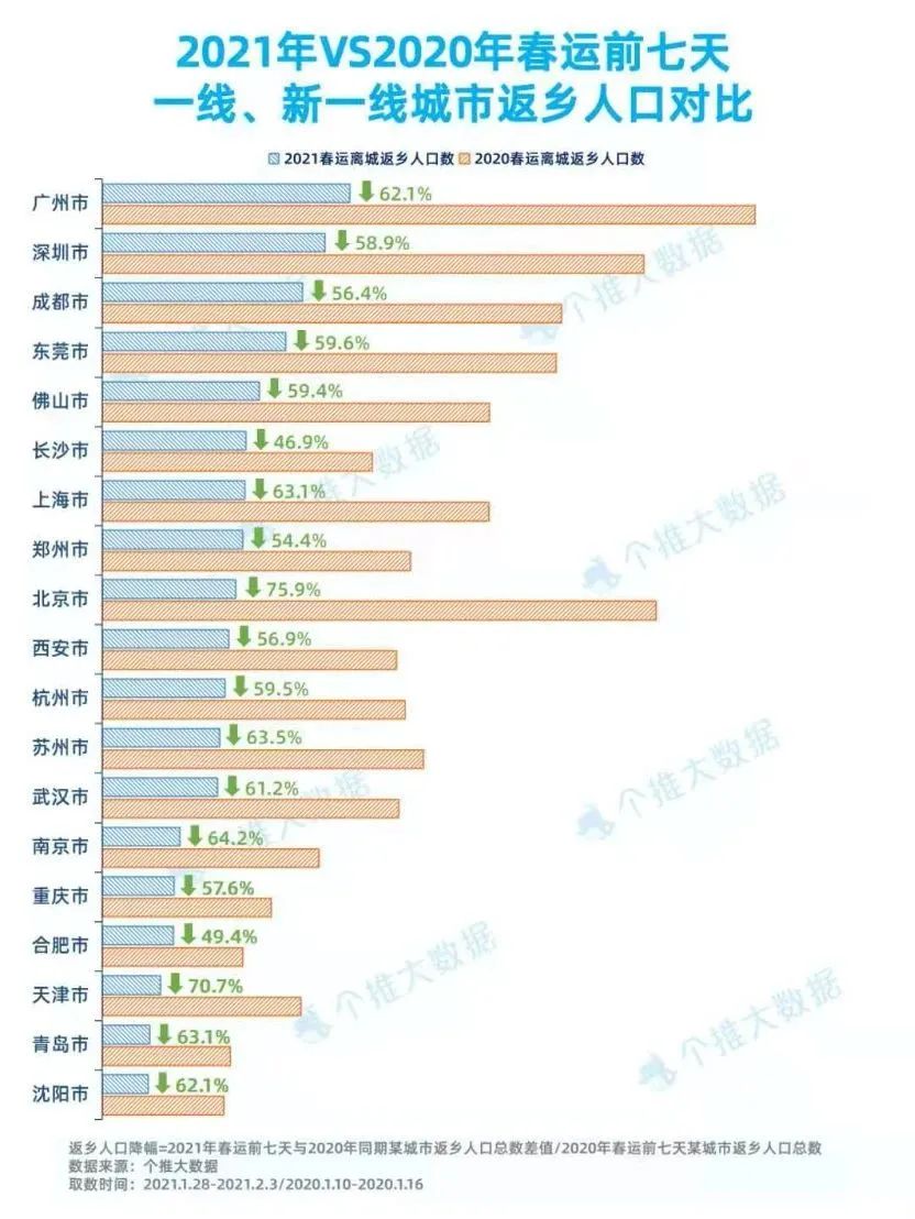 对比往年春运数据会发现,大家对就地过年都表示了理解和支持,2019年全国春运旅客的发送量达到29.9亿人次,但2020年疫情后仅有不到15亿人次。像北京这样的城市,返乡人口直接比去年同期下降了75.9%。