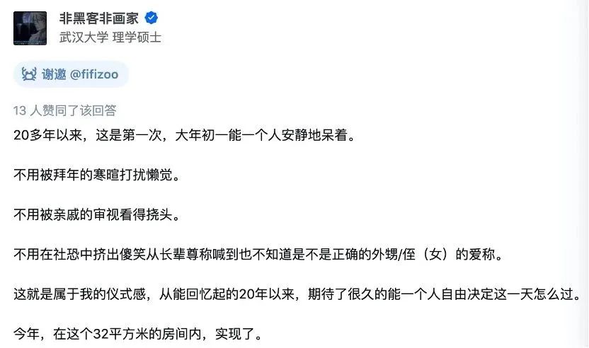 对新一代的人来说,一个人过年,也不意味着孤单,而是意味着自由。不用串亲戚,不用听唠叨,不想看春晚就不看,不想尬聊就不聊。