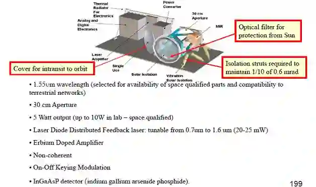 星间距离可长达4万km,而激光波束的强度是按距离的平方递减的,也就是说衰减可能达到-152 dB。接收机要有超高的灵敏度才行,否则背景辐射等噪声产生的误码率将使接收机无法接收。目前,除提高检测器本身灵敏度外,还在探讨外差接收及纠错编码等途径。