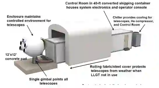 LLGT为LLCD的主要地面终端,这是一个移动型地面接收系统。具有温控外壳,高约4.5m,总质量7t,与目前的无线电通信地面天线相比,尺寸和重量减少约75%。 LLCD 的目标之一是演示验证多孔径合成光信号收发技术。