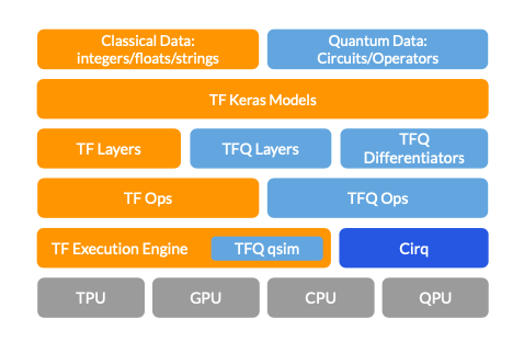 ,显示了它与TensorFlow、Cirq和计算硬件的交互。栈的顶部是要处理的数据。经典数据由TensorFlow本地处理;TFQ增加了处理量子数据的能力,包括量子电路和量子运算符。