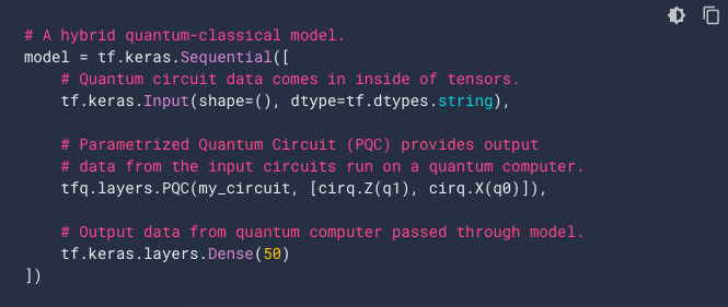更为直白一点,相关量子算法的研究可以调用 TFQ 内部的计算框架,然后用 Python 编程完成运算。另外,可以使用标准Keras功能进行训练。