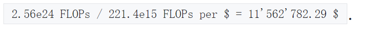 按照这个算法,我们每一美元可以买到 221 PFLOPs。考虑到最后一次训练要用 2.56×10^24FLOPs 的算力,我们的最终花费大约是 1160 万美元:
