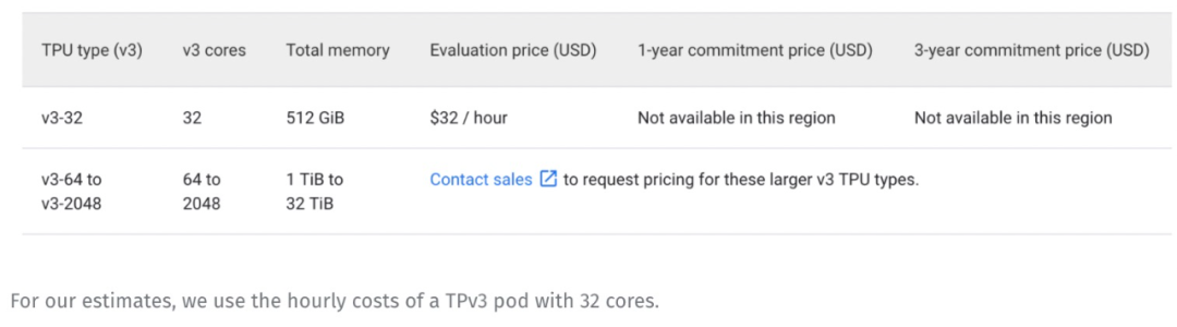 我们可以以每小时 32 美元的价格租用一个 32 核的 TPUv3 pod。约合 1 美元一个 TPUcore-hour。
