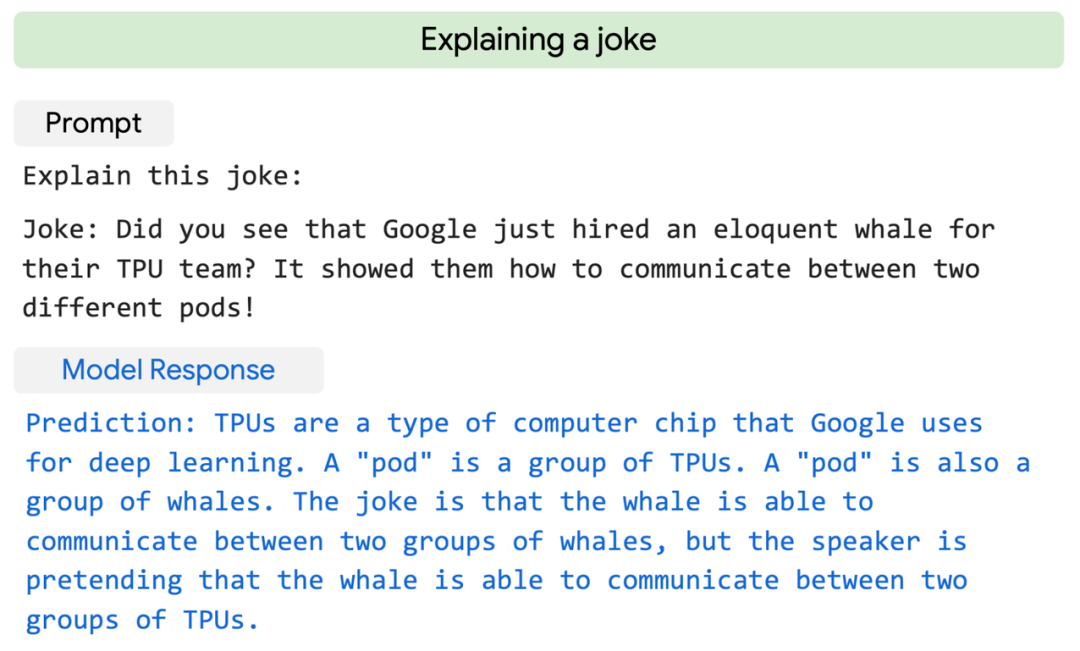 一年之后,Pathways 系统论文终于亮相,Jeff Dean 所在的团队还公布了用它训练的一个大型语言模型——PaLM。实验表明,PaLM 在多语言任务和代码生成方面具有强大的能力,可以出色地完成笑话解读、bug 修复、从表情符号中猜电影等语言、代码任务。