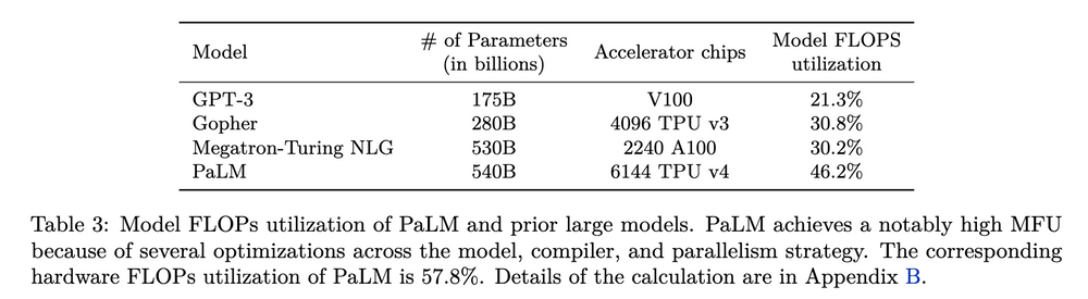 因此,作者假设 PaLM 在 TPU v3 上训练时硬件利用率达到 50%: