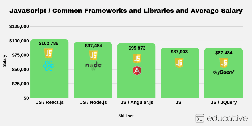 如果没有框架和库,JS就不会有今天的样子。下图显示了专门从事该技术的开发人员的平均工资。可见,同样都是JS的开发人员,但是如果采用了这些不同的框架或库时,会大有不同。