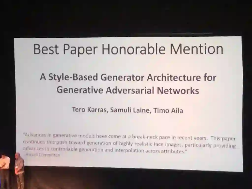 论文奖委员会的授奖理由:近几年来,生成式模型方面的技术进步来到了一个瓶颈期。这篇论文在生成高逼真度人脸这一研究方向上作出了继续的进步,尤其在生成过程的可控制性以及不同属性之间的互相搭配方面作出了改进。