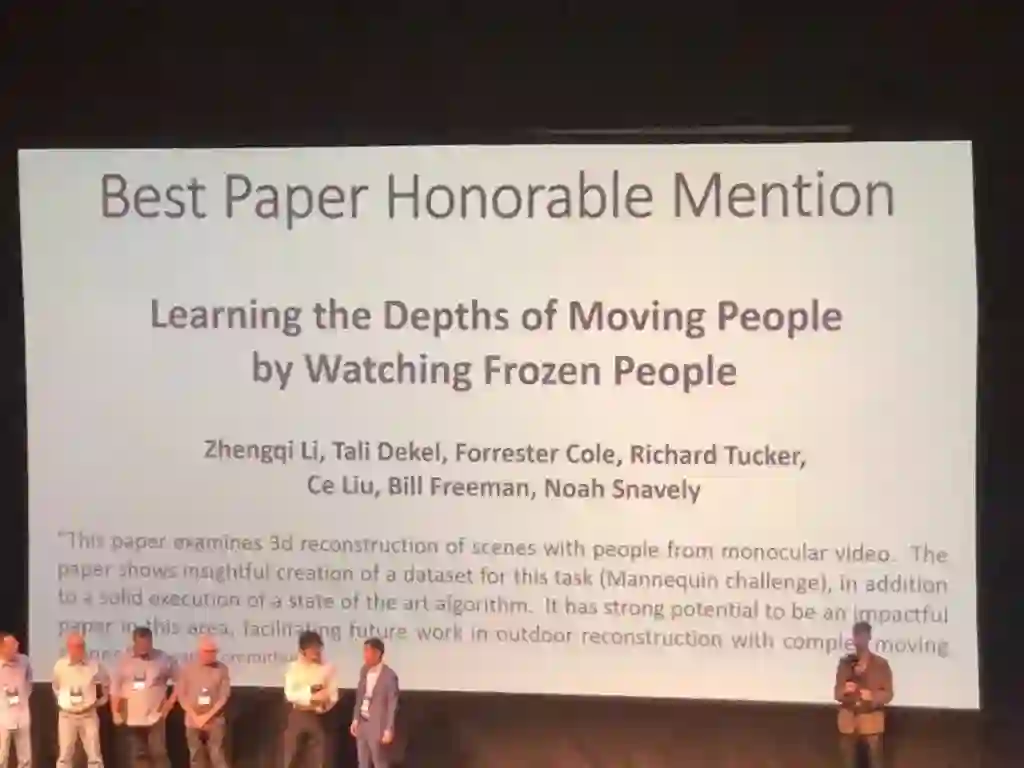论文奖委员会的授奖理由:这篇论文尝试了从含有人的单视角视频重建场景的三维结构。论文中呈现了具有洞见的数据集创建过程(静止不动),而且对当前最优秀的算法的执行也无懈可击。这篇论文很有潜力成为这个领域内具有深远影响的论文,未来针对户外场景、复杂运动场景的三维重建研究都可以从这篇论文获益。