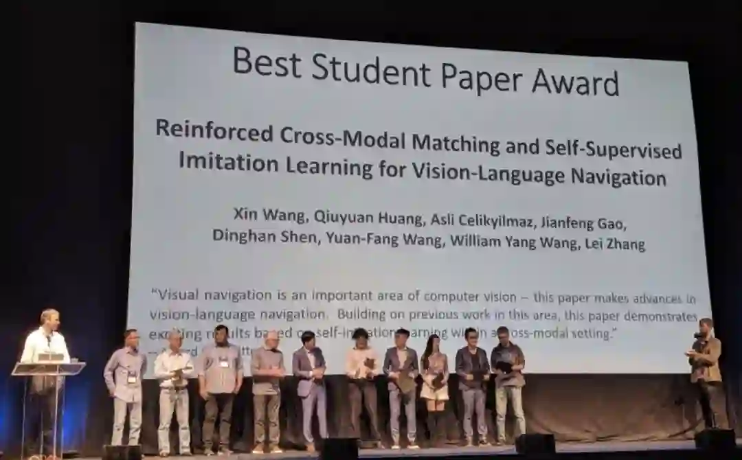 论文奖委员会的授奖理由:视觉导航是计算机视觉领域内的重要方向,这篇论文就在视觉语言相结合的导航中作出了进步。在这个方向中此前研究的基础上,这篇论文通过跨模态环境下的自我模仿学习展现了令人激动的结果。
