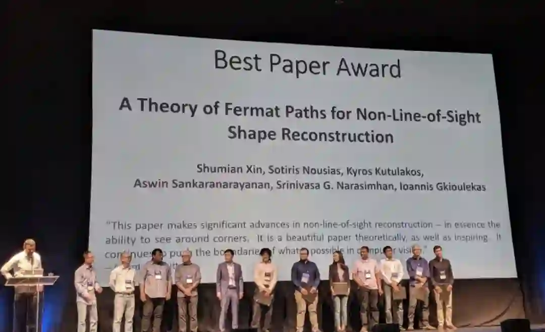 论文奖委员会的授奖理由:这篇论文作出重大进步的问题是非视线内的物体形状重建,换句话说就是能看到墙角后面的东西。这篇论文的理论部分非常优美,而且同样非常给人带来激励。它把计算机视觉所能解决的问题的边界继续向前推进了一步。