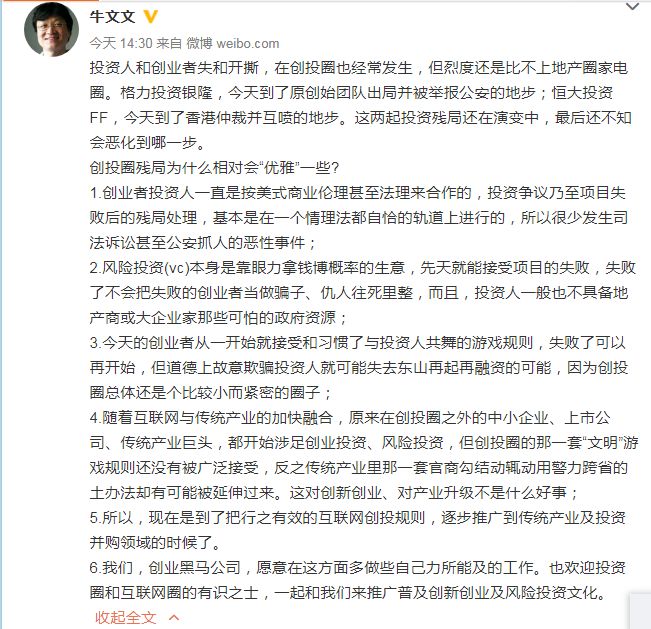 在创业黑马董事长牛文文看来,投资人和创业者和开撕,在创投圈并不少见,只是烈度比不上地产圈和家电圈。“格力投资银隆,今天到了原创始团队出局并被举报公安的地步;恒大投资FF,今天到了香港仲裁并互喷的地步。这两起投资残局还在演变中,最后还不知会恶化到哪一步。”