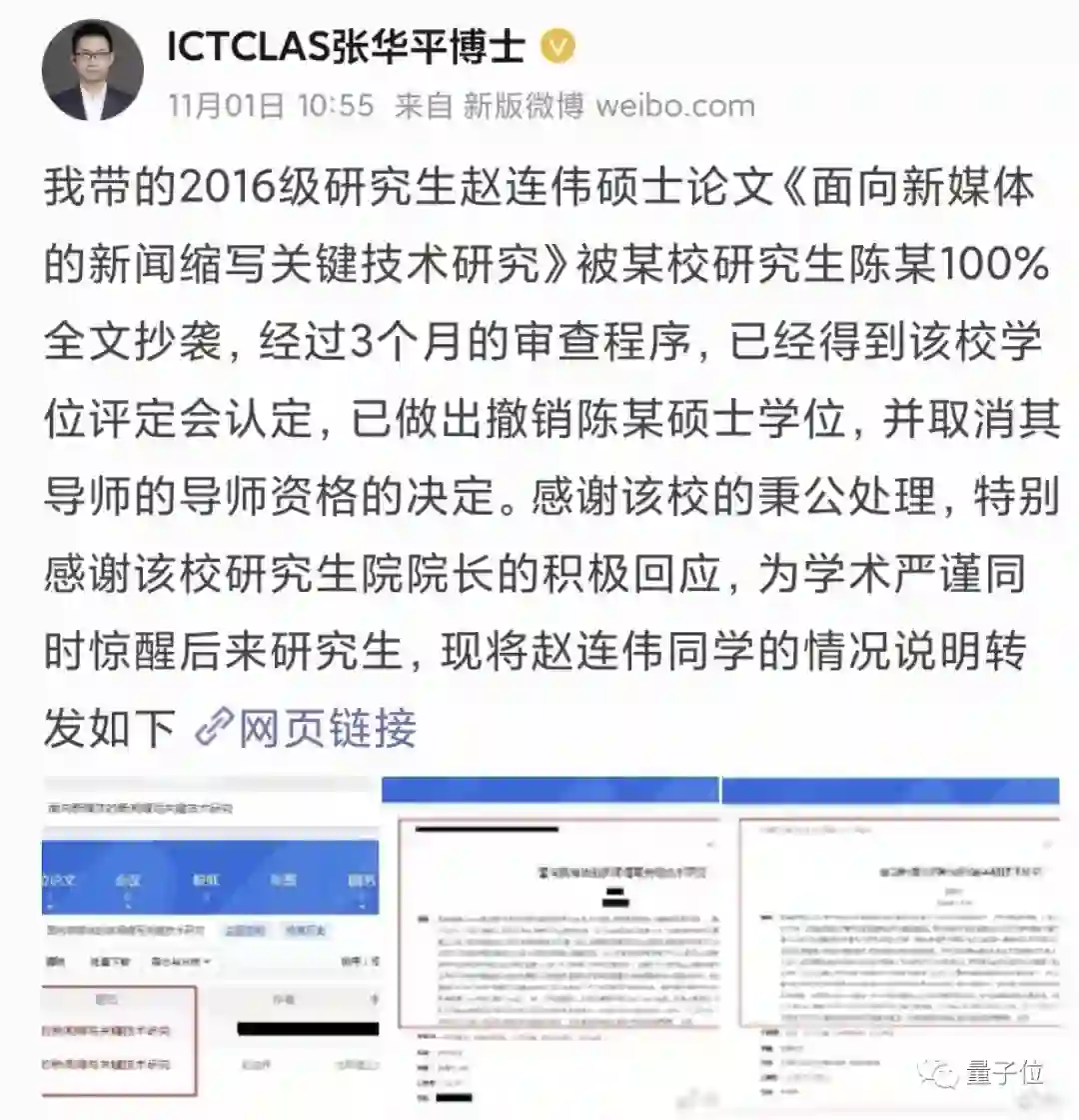 北理工副教授张华平发微博称,他带的学生硕士学位论文被南方某985高校学生陈某抄袭。