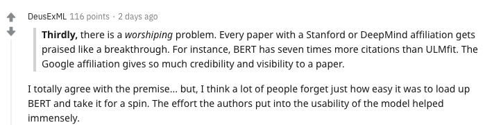 关于第三宗罪也有网友为Google鸣不平,BERT让语言模型变得非常易用给其他研究者做了很多铺垫,确实该获得更多关注,ULMfit引用量没BERT多也很自然。