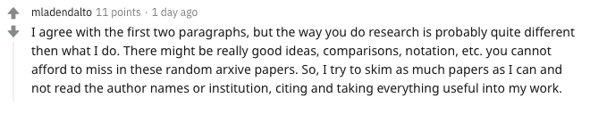 也有人反驳这种偷懒的行为。「我就能不看作者,快速读完一堆论文」。好吧,一目十行君真的有。